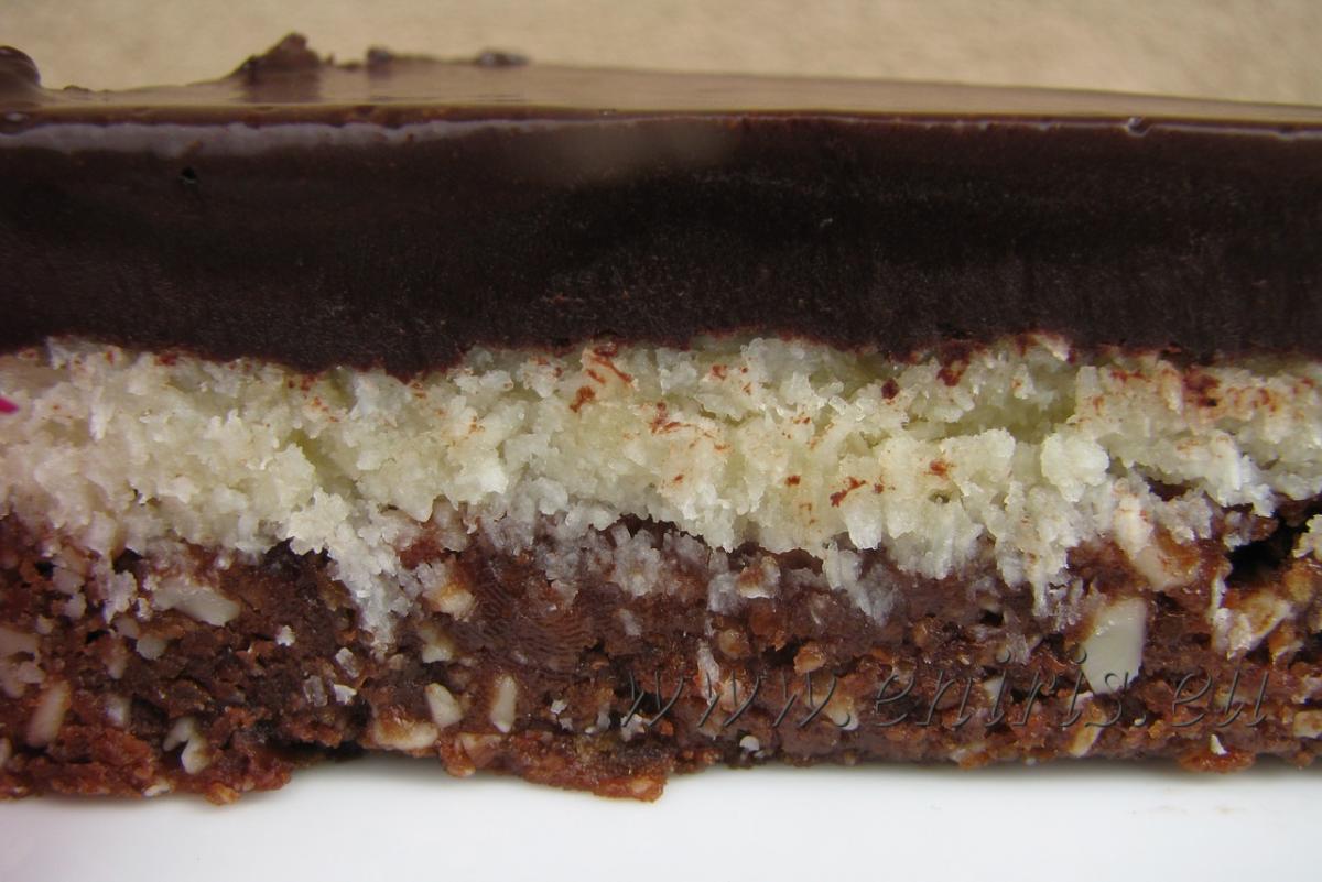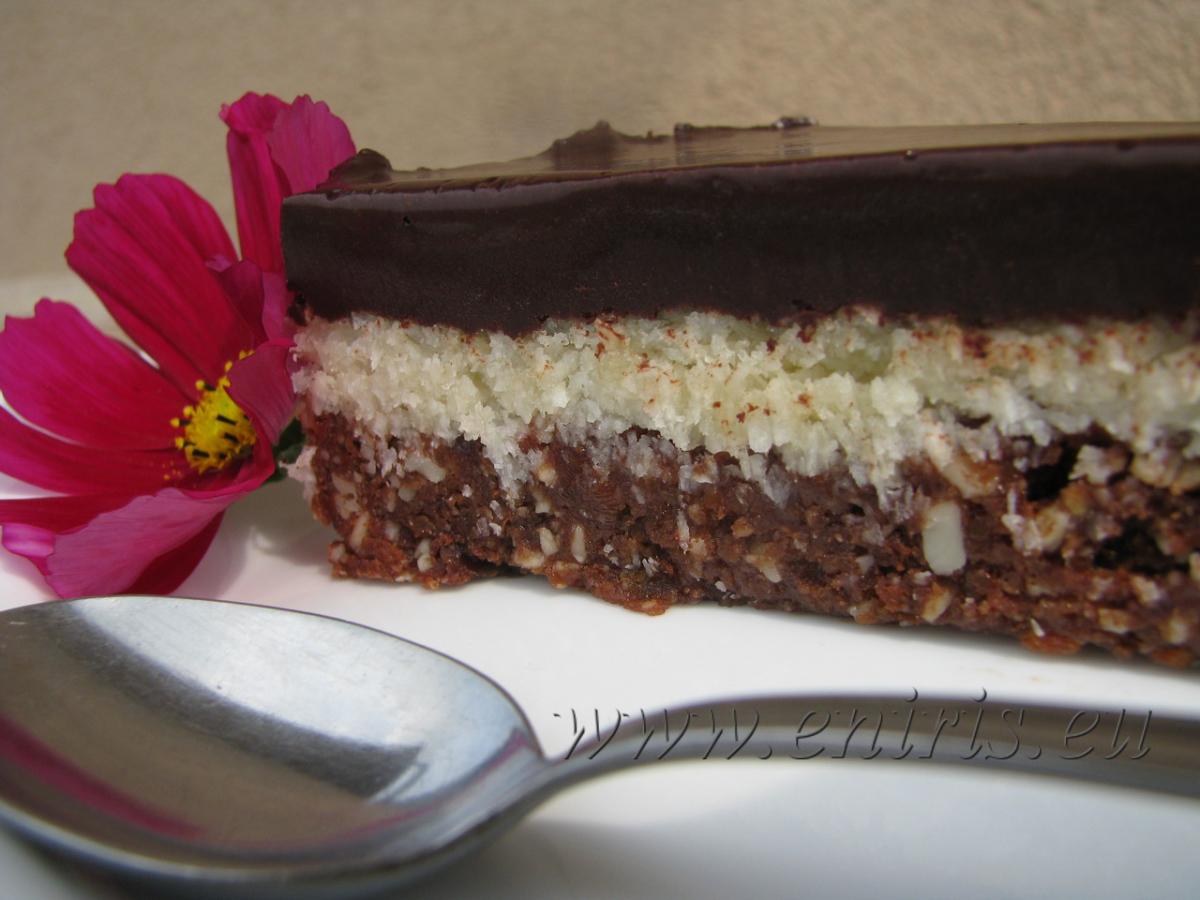 Suroviny na cesto dáme do mixéru a mixujeme, kým dostaneme lepkavú hmotu. Dáme ju na dno prichystanej tortovej formy a rovnomerne utlačíme. Ja mám termomix, ktorý svojmi nožmi rozbije orech akoby boli mleté. Potom dáme do mixéru suroviny na plnku a mixujeme, kým sa hmota spojí. Vyberieme z mixéru a navrstvíme na cesto, rovnomerne rozotrieme. Teraz pripravíme  polevu. Kakaové maslo nad slabou paru roztopíme, pridáme sirup, zmiešame, odložíme z pary a pridáme kakaový prášok a spracujeme na tekutú polevu. Ak chcete hrubšiu vrstvu polevy, lebo ste čokoholik ako ja, tak dajte viac surovín. Roztopenú polevu vylejete na kokosovú vrtsvu a tortu dajte na noc zachladiť.