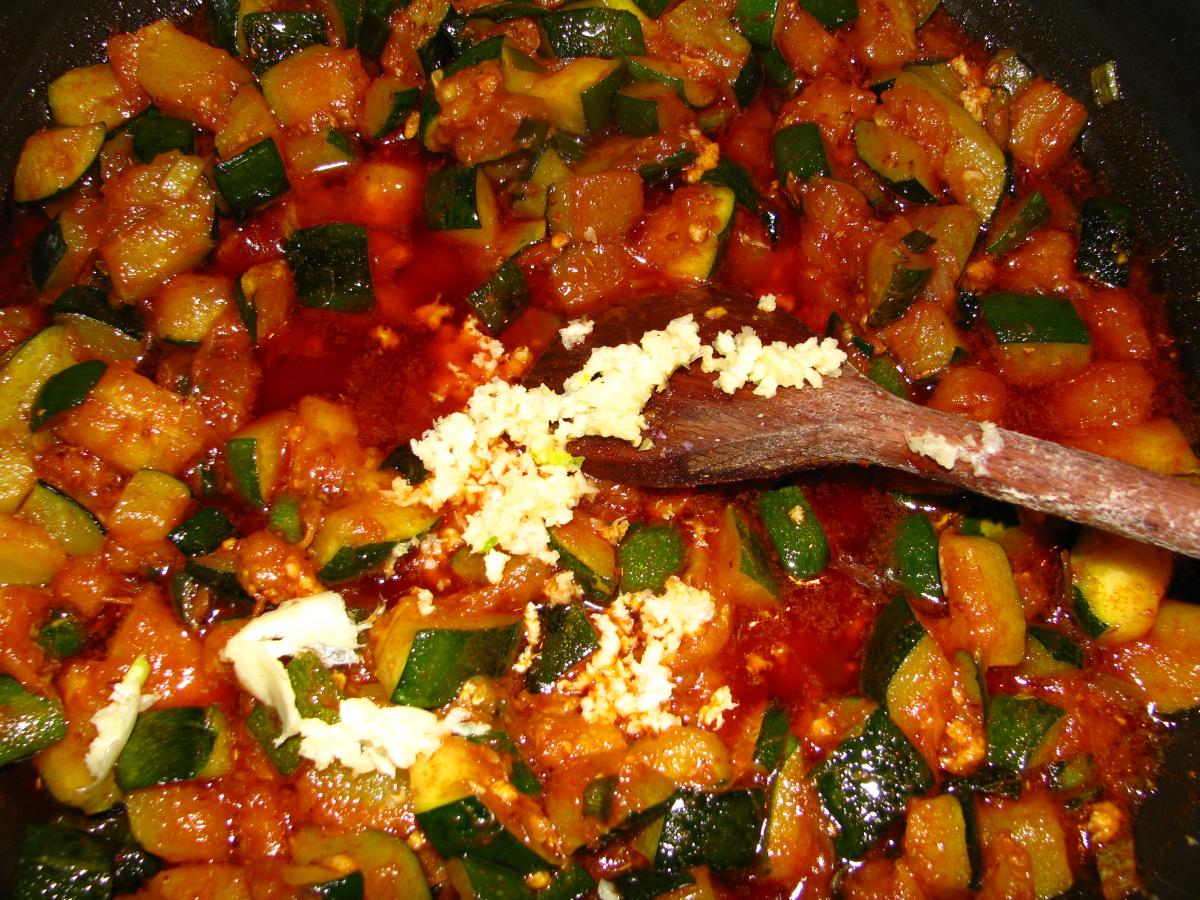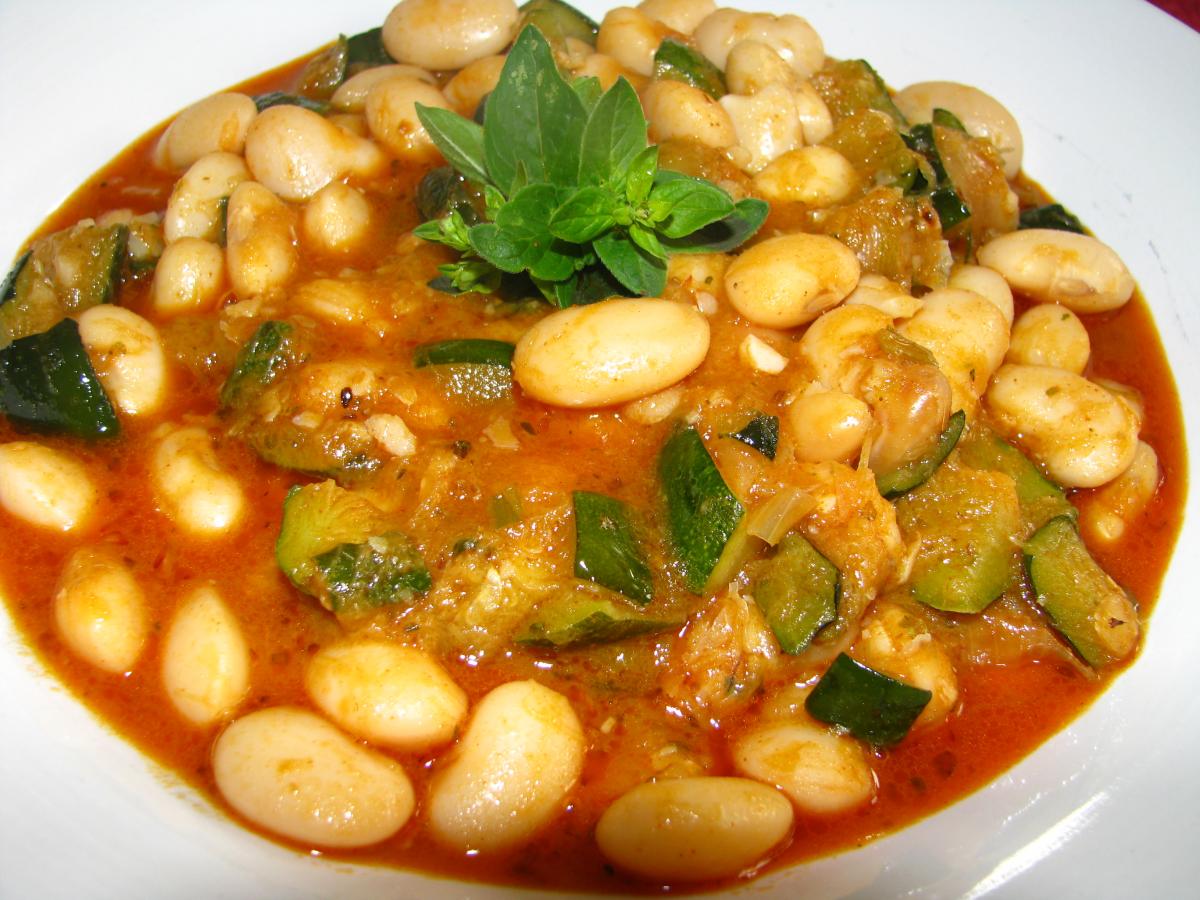 Fazuľu namočíme večer vopred a na druhý deň dáme variť do vody, bez soli. Ak už je fazuľa skoro dovarená, tak sa pustíme aj do cukiet. Nakrájame ich na menšie kocky, osolíme podľa chuti,  a na panvici do mäkka dusíme aj s nakrájanou cibuľou. Môžete použiť masť,  pravé maslo či olivový olej. Odstavíme cukety a pridáme asi lyžičku mletej papriky, záleží aké množstvo robíte a ako veľmi obľubujete chuť papriky. Ja ľúbim, ak je šťava v guláši pekne červená. Nakoniec pridáme drvenú rascu, štipku bieleho mletého korenia, pretlačíme cesnaky  a riadne premiešame.