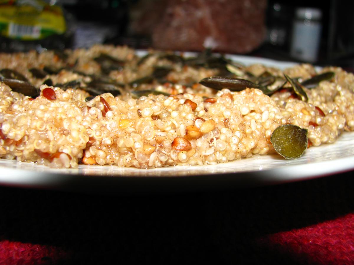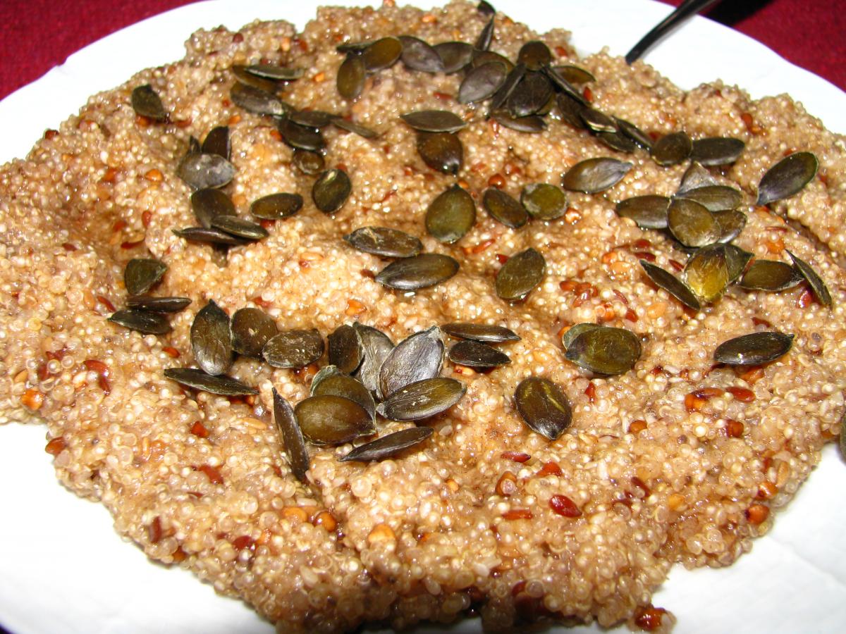 Ako na to? Uvarím quinou v troche vody, asi tak 1,5 deci semena quinoe a vody tak 2 centi nad semenami. Pridám tak štipku soli. Varím asi 15-20 minút, medzitým samozrejme koštujem, či je už mäkké. Ak už je, tak prisypem ľanové semienka, aj obyčajné, aj zlaté, ešte sezam, chia, možno trochu pohanky, veľa pohánky neznesiem, má pre mňa divnú chuť. Pridám tak osminku masla a zamiešam, odstavím z ohňa, tie ostatné semená netreba uvariť, nech tam ostane aj kopec surových semiačok.