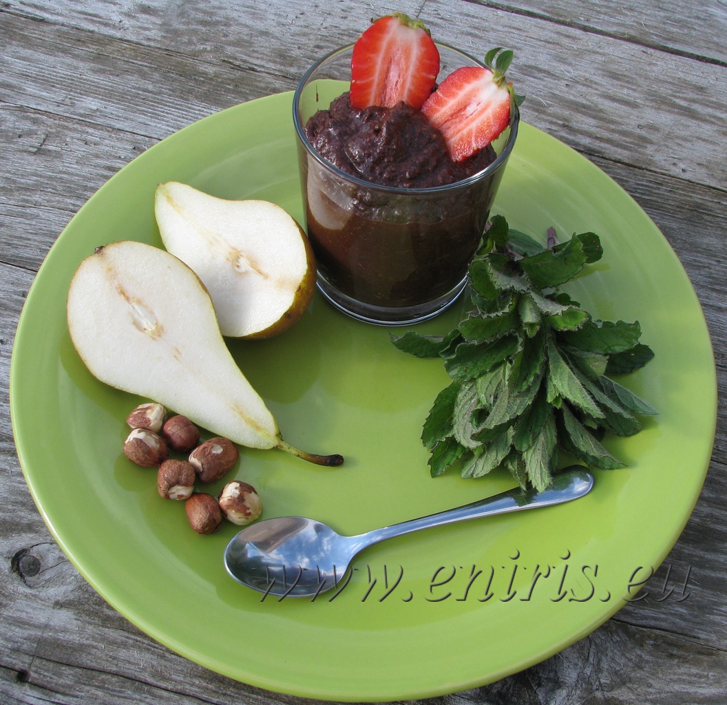 Dávky jednotlivých komponentov nechám na vás, máte to radi rôzne sladké a rôzne tuhé či riedke. Hruška, alebo iné ovocie túto nutellu zriedi.  Pridaním viacej kakaa a lieskovcov dostanete hutnejšiu nutellu.