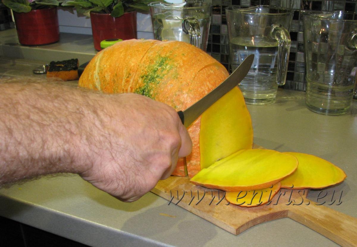 Tekvicu iba nahrubo nakrájame a dáme do hrnca s vodou a soľou variť. Keďže mám vlastné tekvice a v čase zberu bola táto ešte mäkká, tak som ju nešúpala ale krájala spolu so šupkou. (Klamem, krájal to manžel, to je jeho ruka na obrázku, na mňa to bolo veľké.) Do hrnca dáme všetkého toľko, aby bol plný hrniec tekvice aj vody.